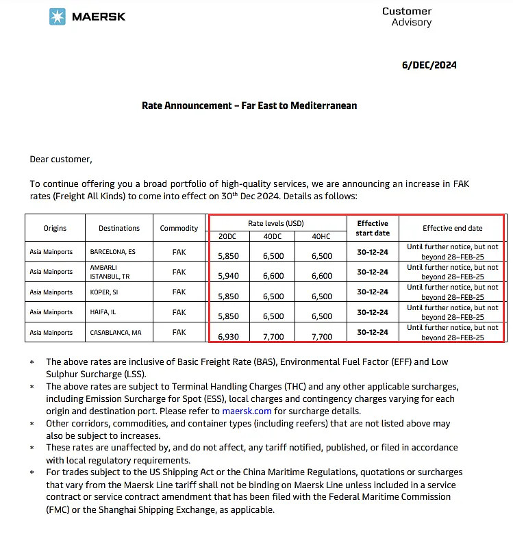 馬士基公司率先行動,于12月6日發布公告,宣布自2024年12月30日起,提高遠東至北歐地中海的FAK費率,以繼續為廣大客戶提供高質量的服務。