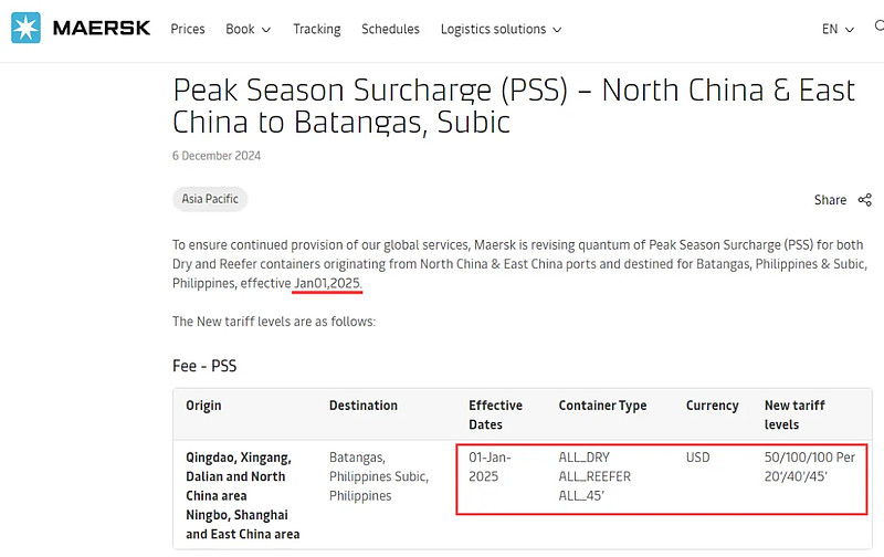 此外,馬士基還決定自2025年1月1日起,對從華北和華東港口出發運往菲律賓八打雁、蘇比克及馬尼拉的干集裝箱和冷藏集裝箱征收旺季附加費(PSS),以應對旺季的運輸需求。