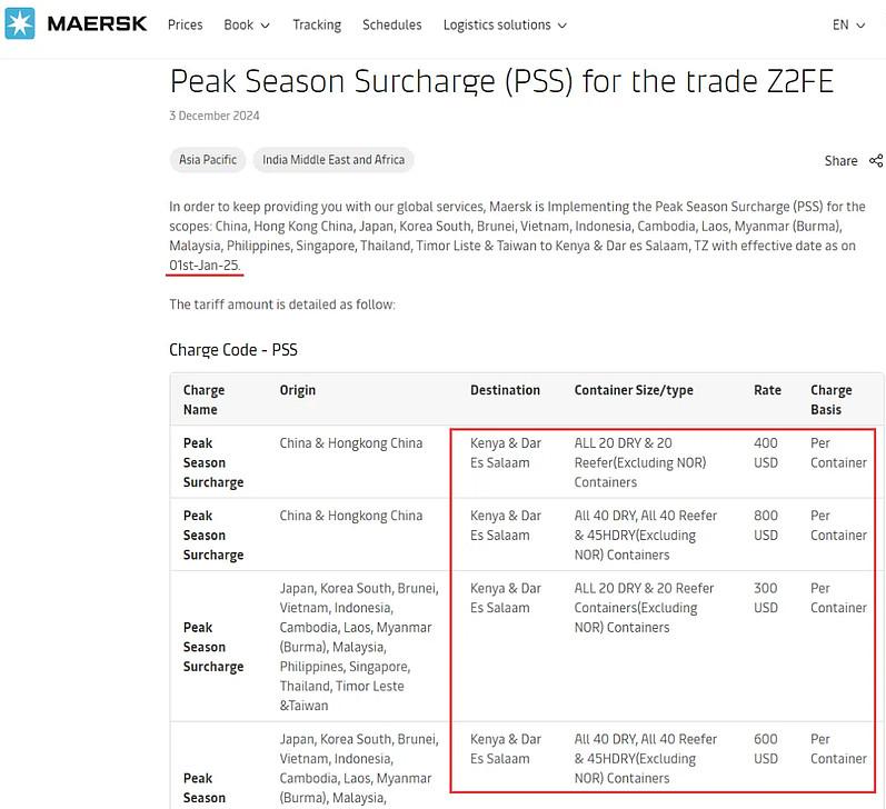不僅如此,馬士基還將旺季附加費PSS的征收范圍擴大到了中國、中國香港等地至肯尼亞和達累斯薩拉姆的航線,生效日期同樣為2025年1月1日。此外,自2024年12月19日起,馬士基還調整了遠東至中東地區的旺季附加費PSS,直至另行通知。